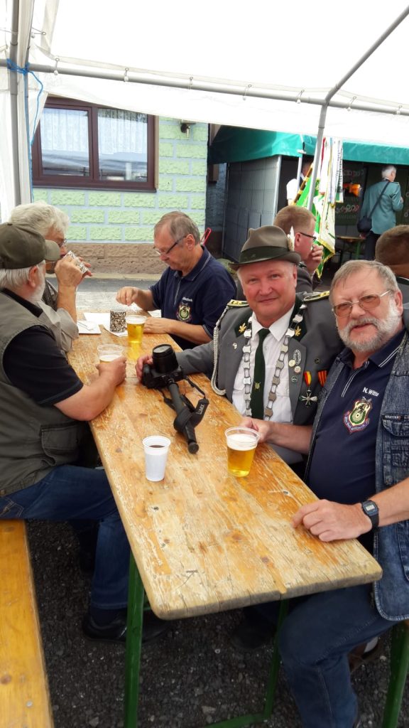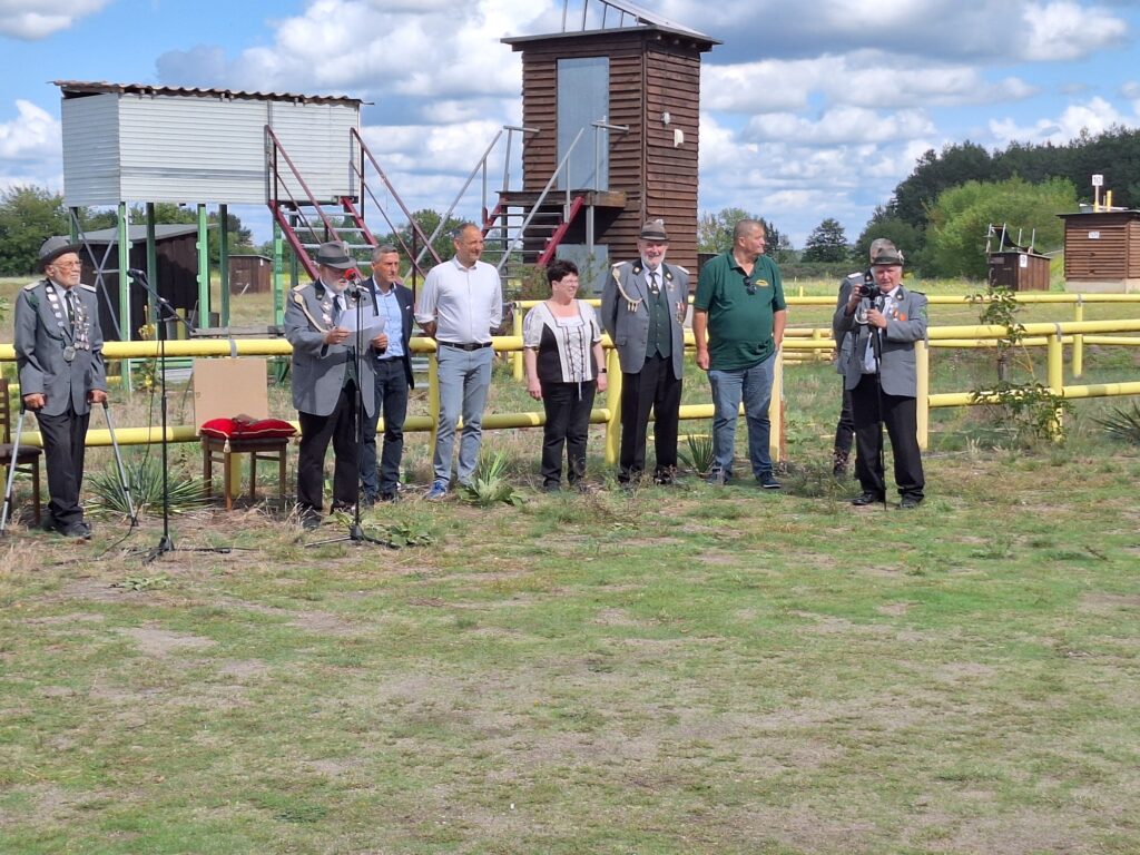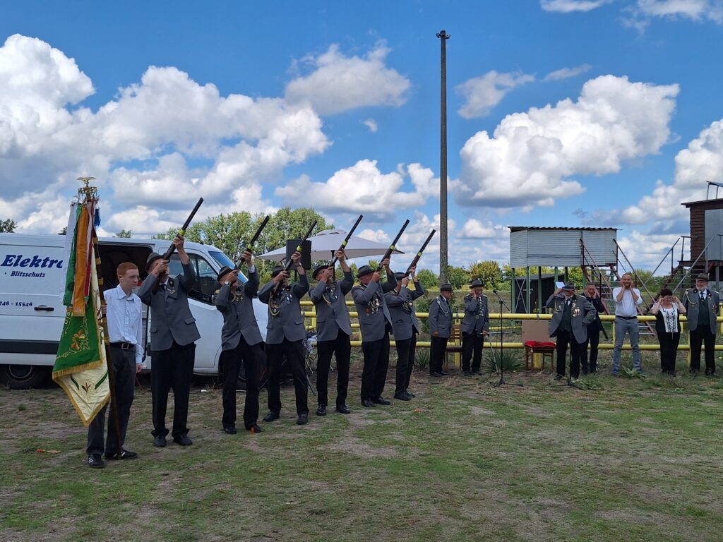 v.l. Oskar Höhne mit Fahne, Schützenvertreter aus Treuenbrietzen, Jüterbog (mit dem Magnumpokal) und nochmals Jüterbog von den Jüter-Bock-Schützen